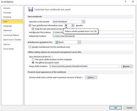By default, Excel autosaves every 10 minutes. However, this interval can be changed to any other time interval, such as 5 minutes, 15 minutes, 30 minutes, or even an hour. To change the interval, go to File > Options > Save. Under “Save workbooks,” select the desired interval from the drop-down menu.